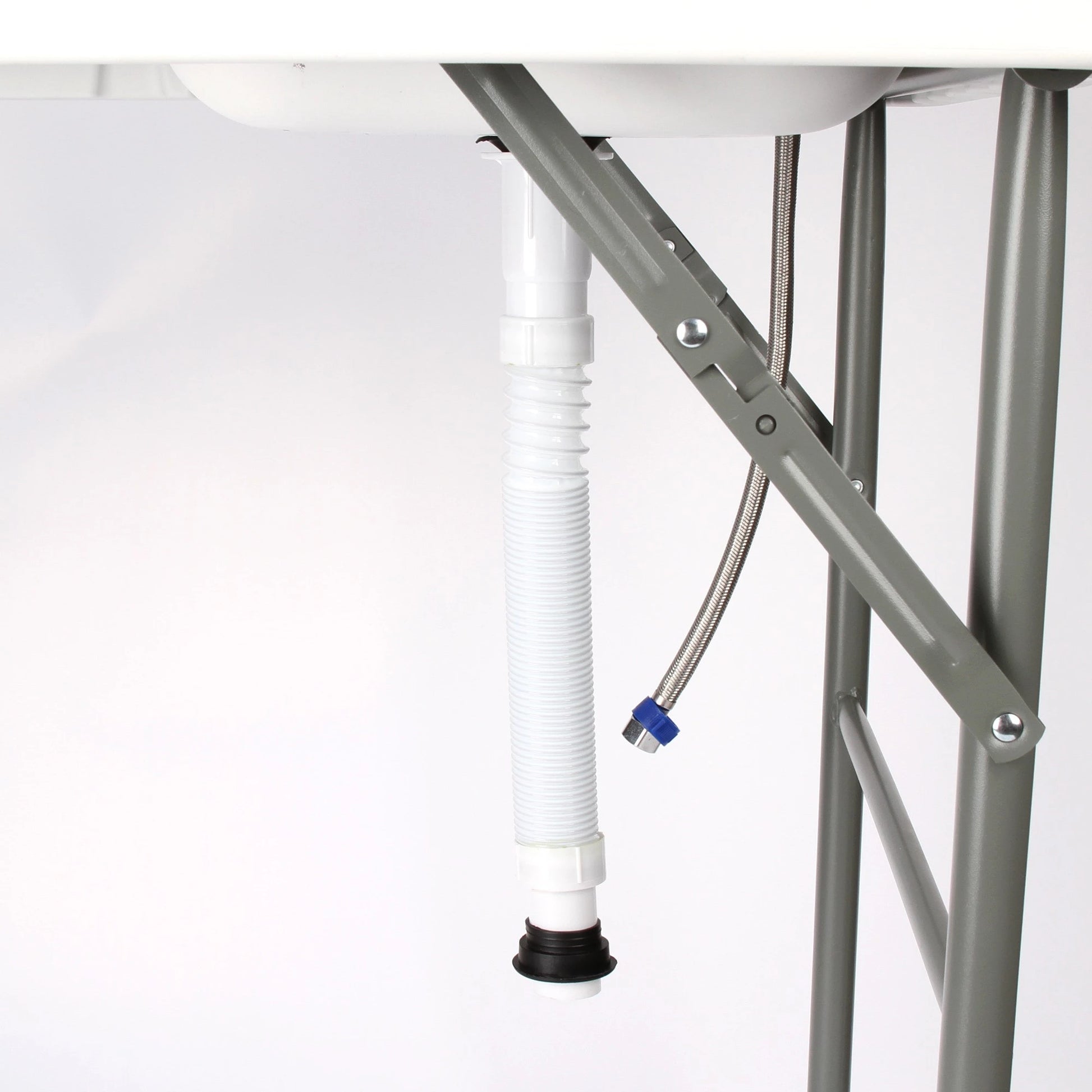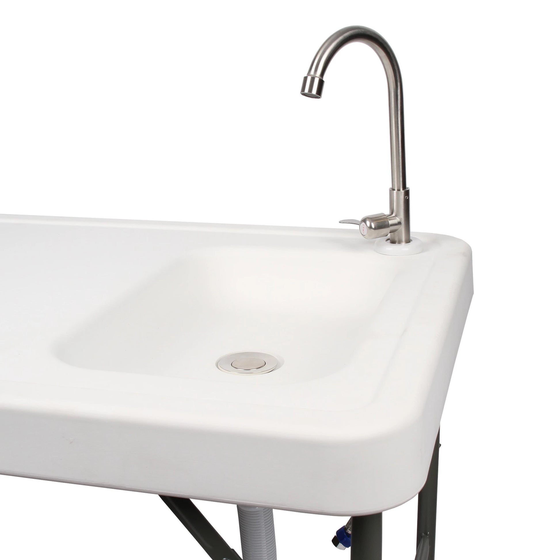 Bordet är utrustat med vattenkran och kan enkelt kopplas till en vanlig trädgårdsslang, vilket gör rengöringen ännu smidigare och mer hygienisk. Konstruktionen är stabil och tillverkad i slitstarka, lättskötta material som tål regelbunden användning.