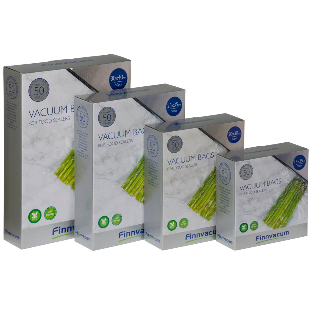 Räfflade vakuumpåsar från Finnvacum är tillverkade i Finland och utvecklade för att ge perfekt vakuumförpackning vid både livsmedelsförvaring och sous-vide-tillagning. Tack vare den räfflade strukturen på ena sidan och en slät yta på den andra skapas en effektiv luftkanal som gör att all luft sugs ut snabbt och säkert, vilket ger ett tätt och hållbart förslutningsresultat.